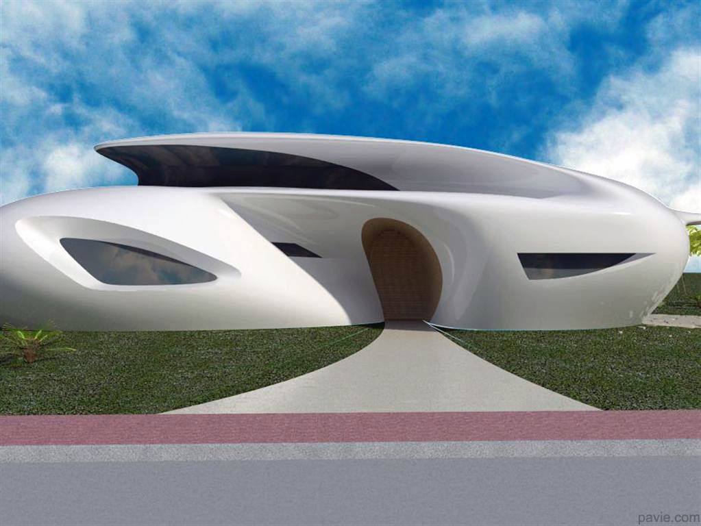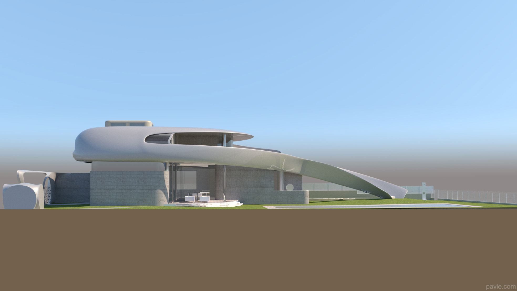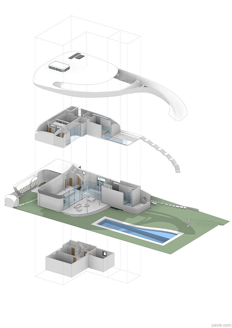 Private house located 700 meters from the beach. Glass facade and a set of balconies towards the pool and sea. Shell including flowing and aerodynamic lines, wide openings towards the pool and the sea – protected from the sun, with natural ventilation.