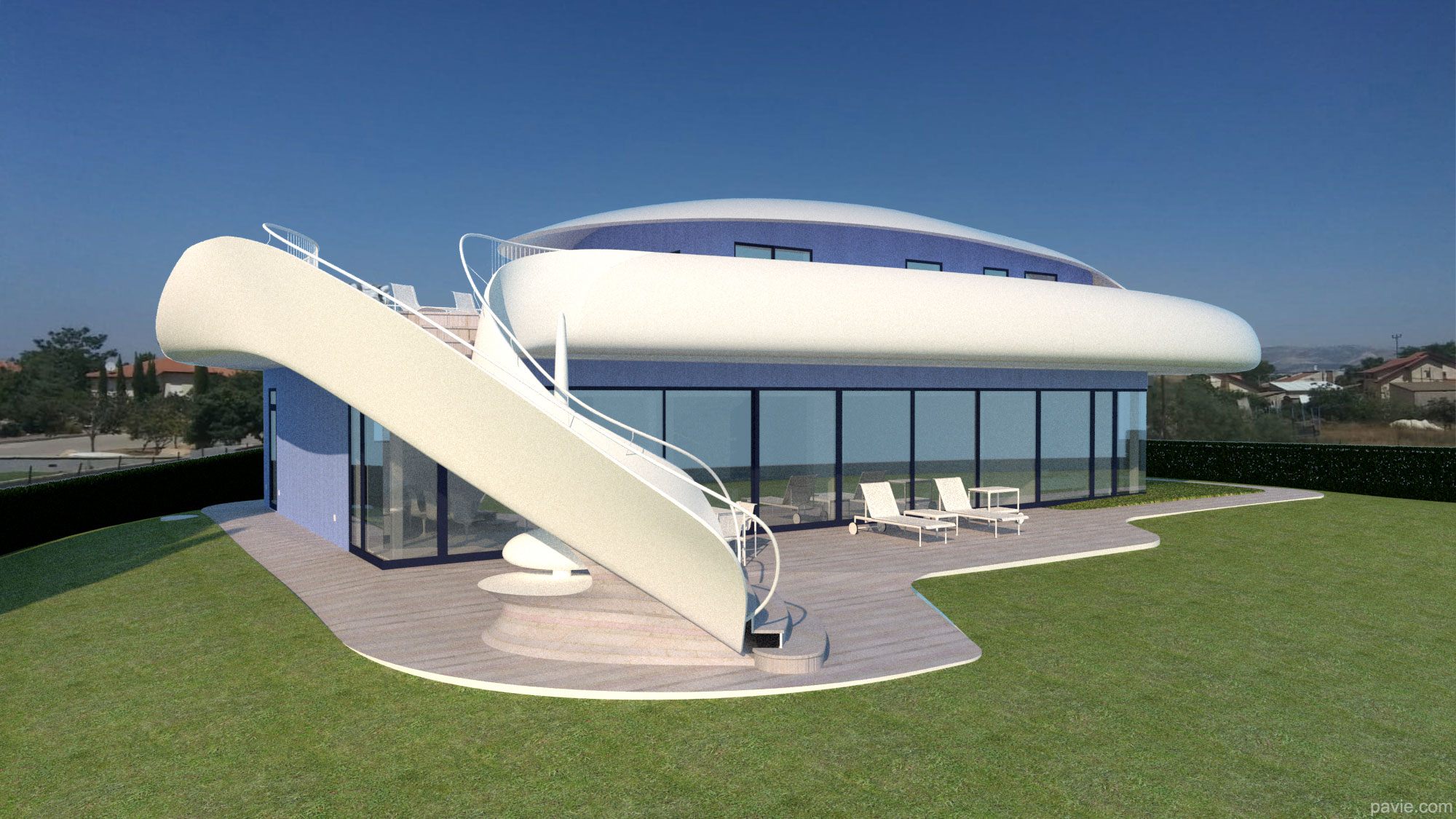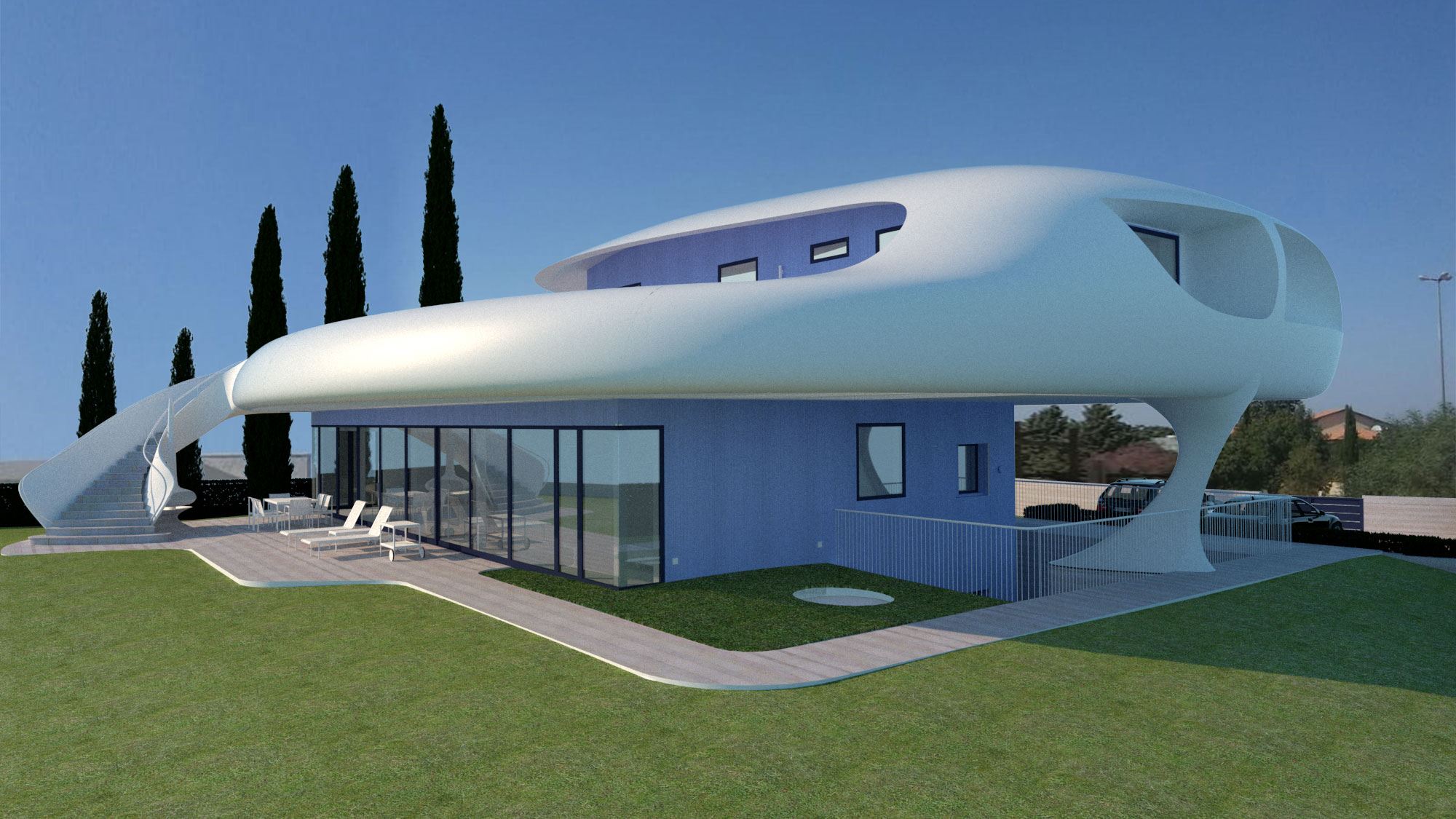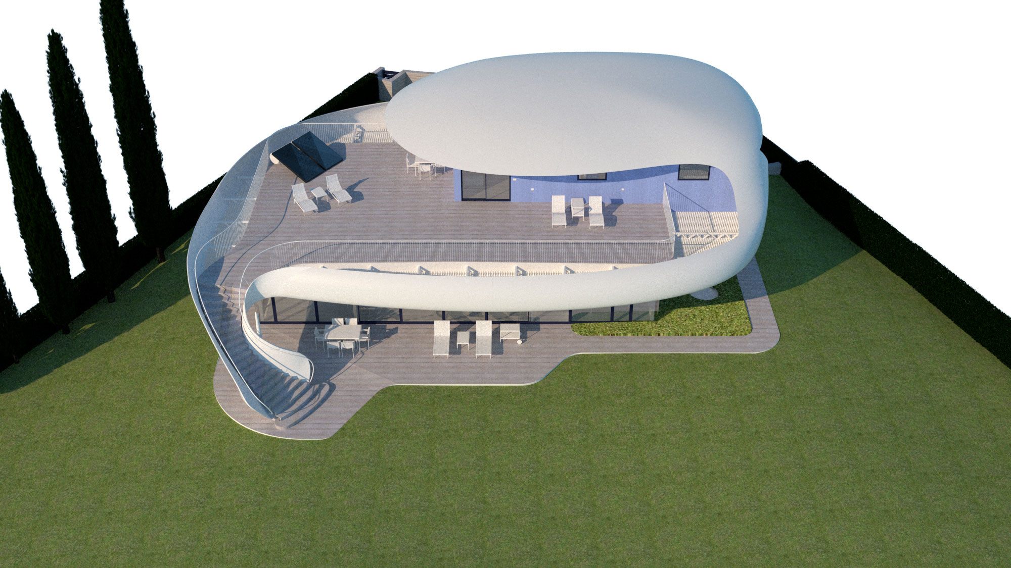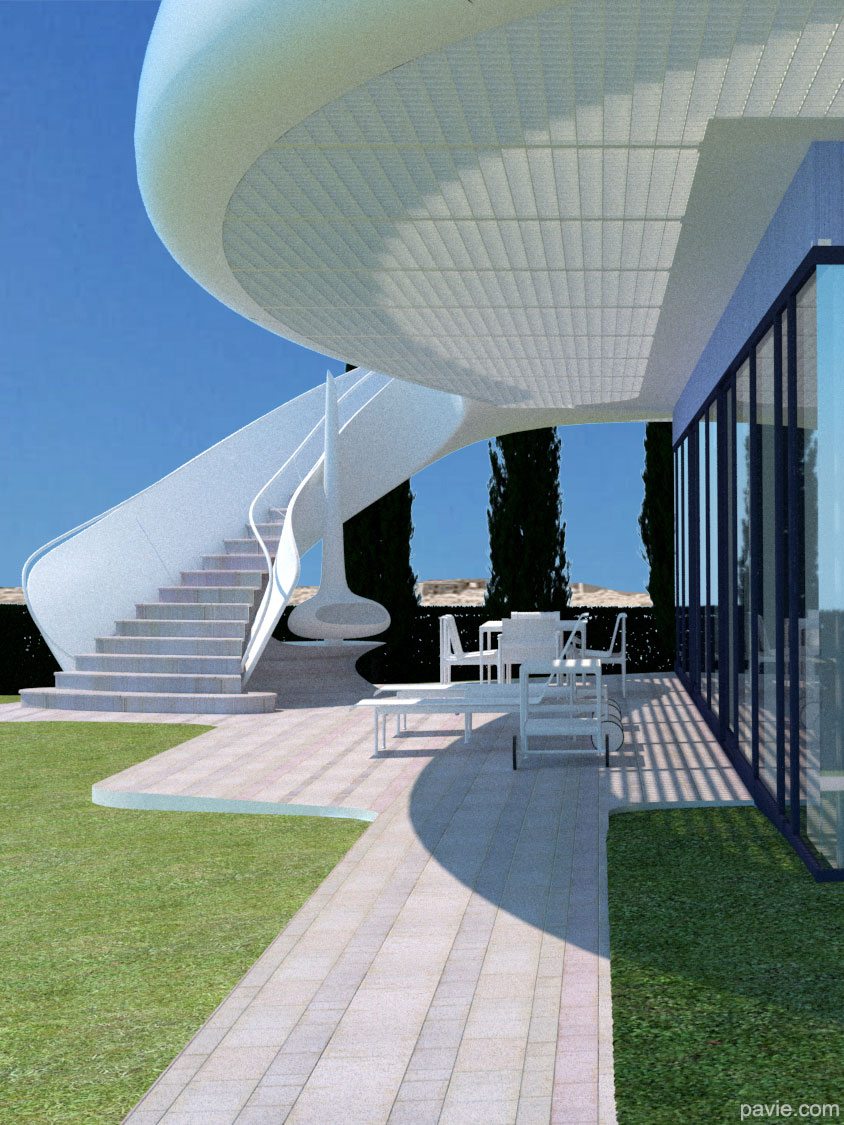 aerodynamic lines matching the view, large, shadowed areas with a huge balcony in front of the view. Feeling of "being on a yacht sailing over the landscape"