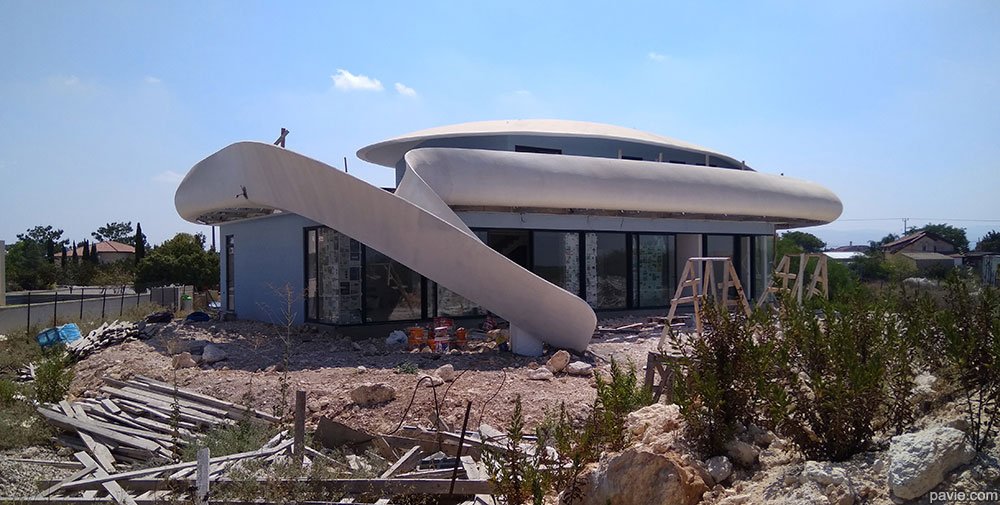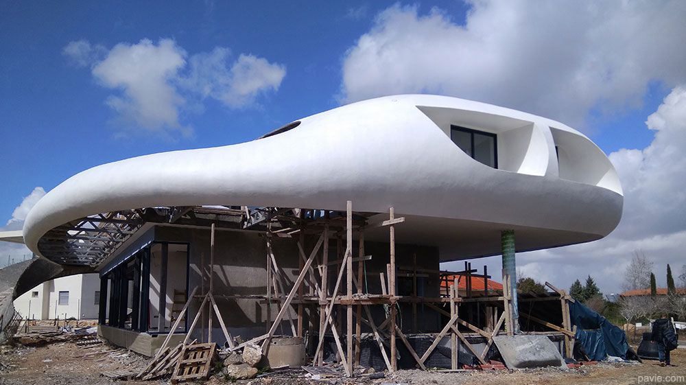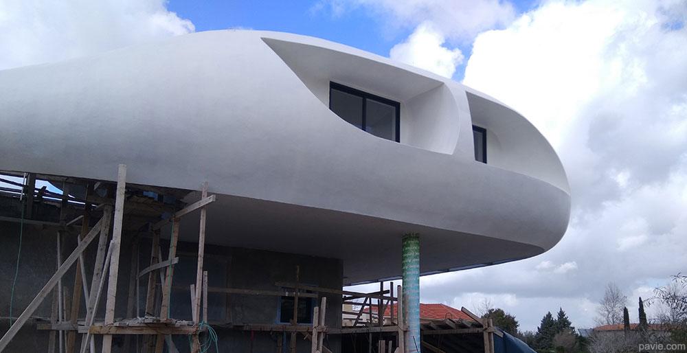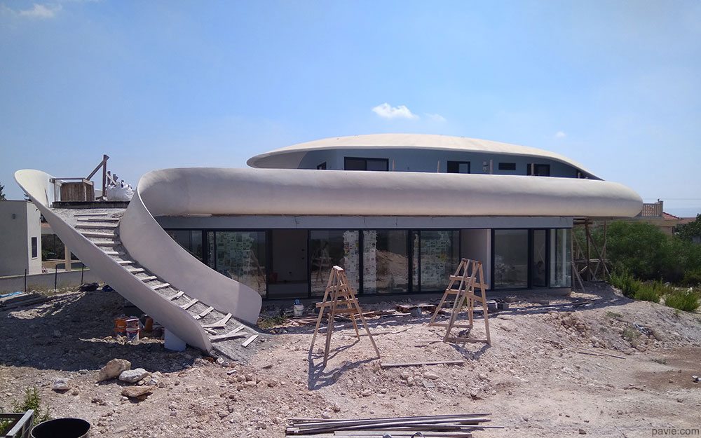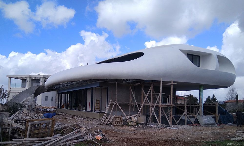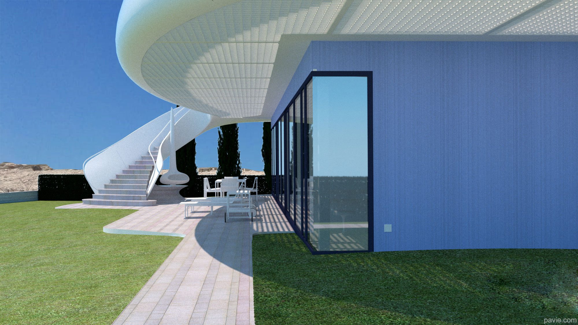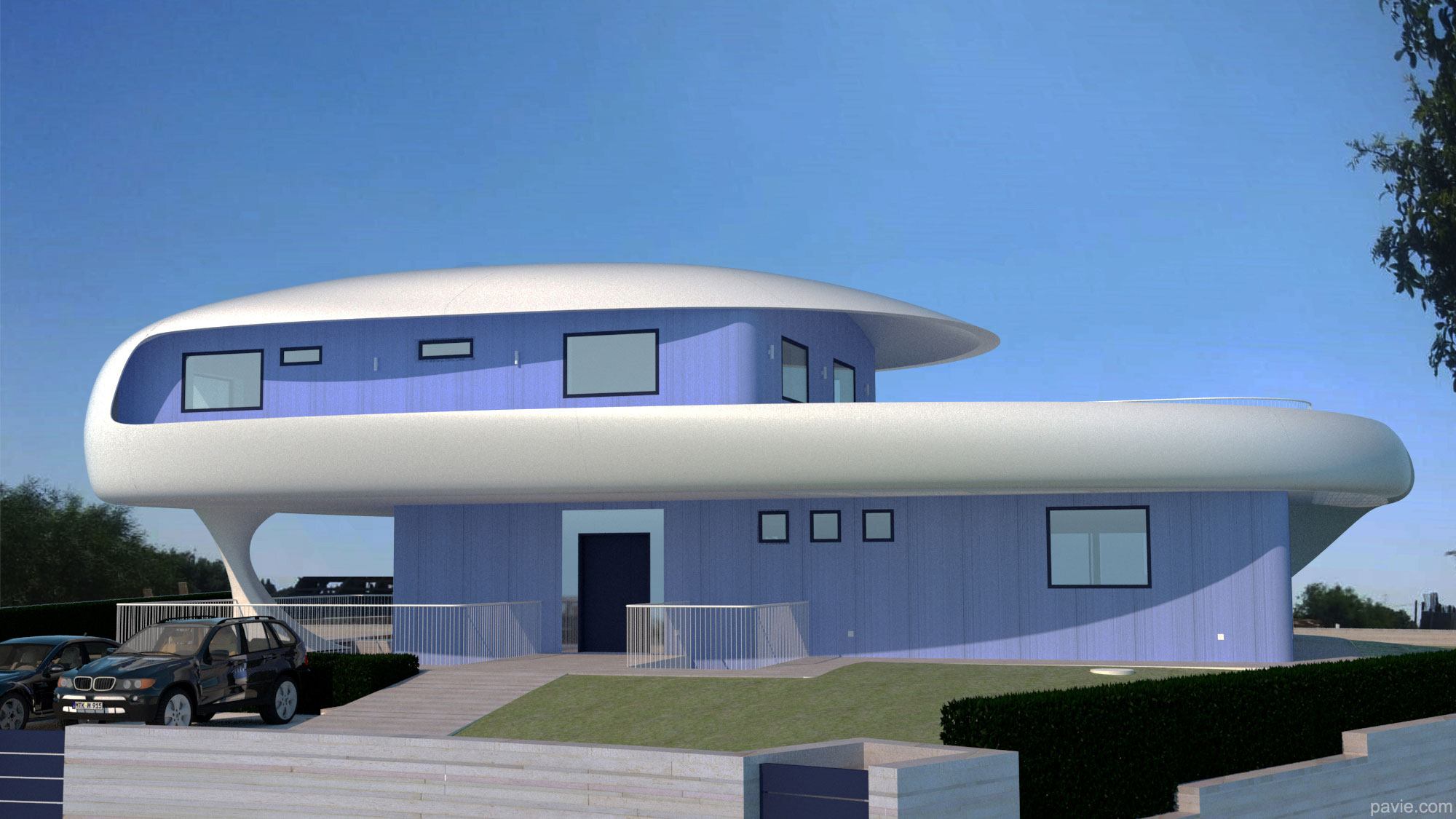aerodynamic lines matching the view, large, shadowed areas with a huge balcony in front of the view. Feeling of "being on a yacht sailing over the landscape"